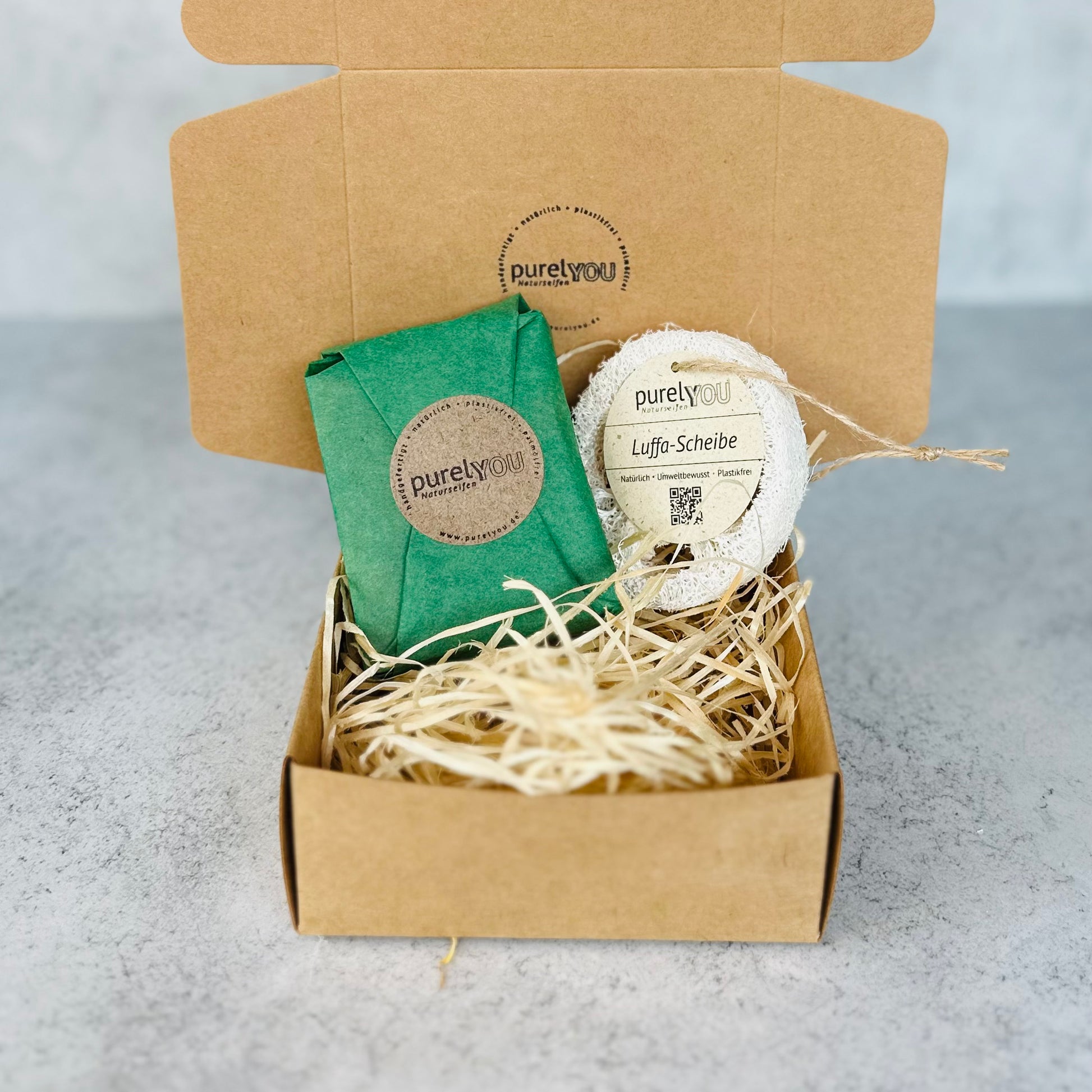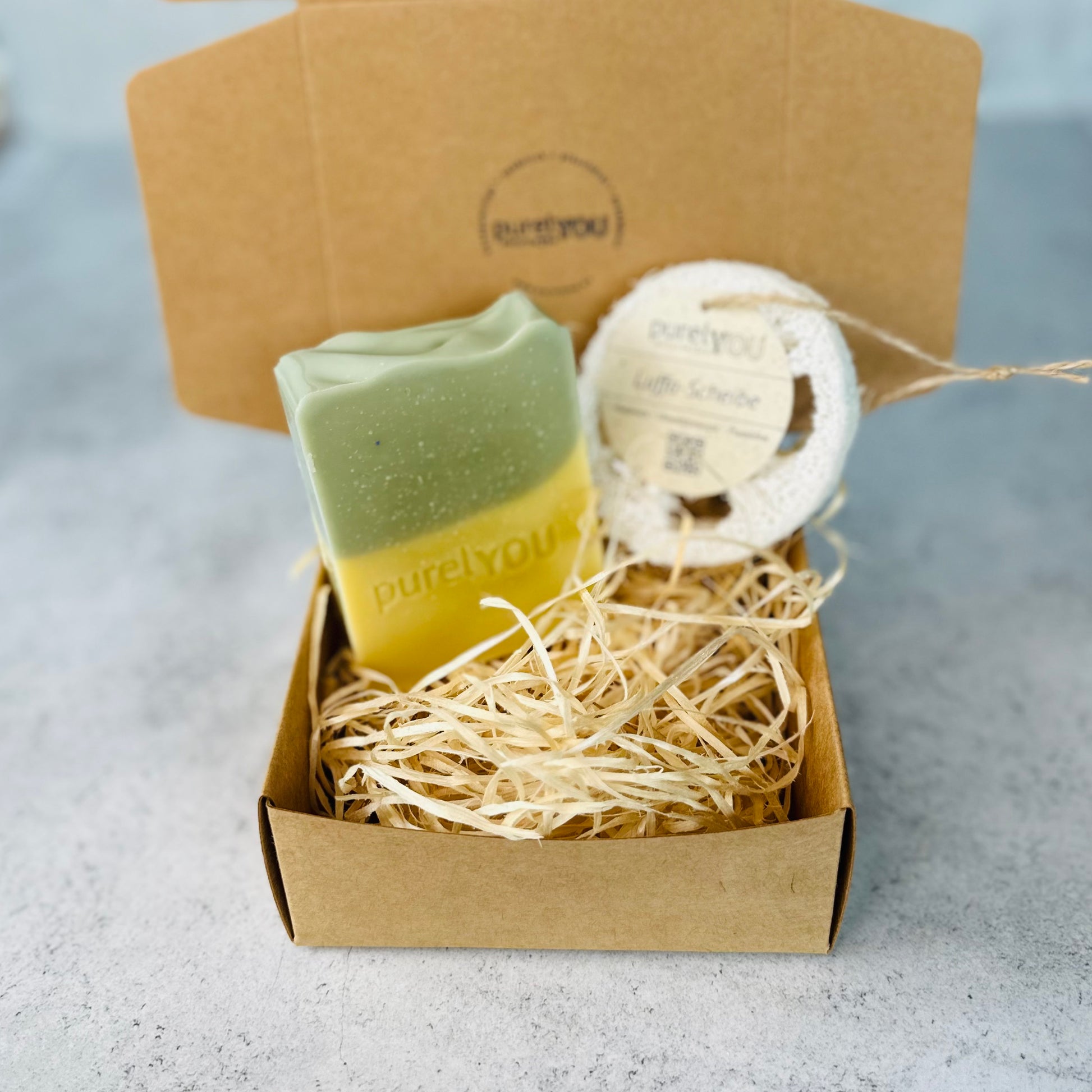Manchmal braucht es nicht viel – nur einen Moment für sich. Die Geschenkbox „Kleine Auszeit“ ist genau dafür gedacht: eine liebevolle Geste, die zeigt, dass du an jemanden denkst – oder an dich selbst. Mit einer handgemachten Naturseife und einer Luffascheibe als nachhaltiger Seifenablage schenkt sie einen kleinen Moment der Ruhe und Pflege im Alltag.